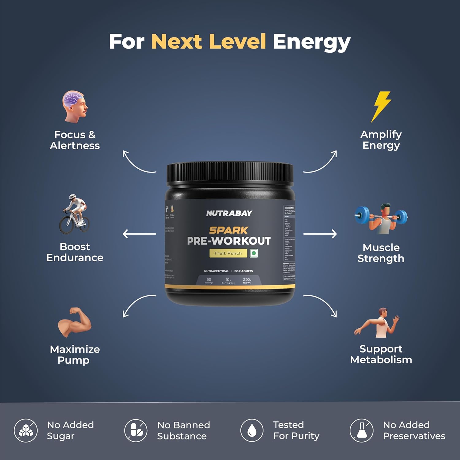 Nutrabay Gold Spark Pre-Workout provides you the support required to increase strength and muscles pumps allowing you to lift heavier, run further faster and surpass your regular physical performance