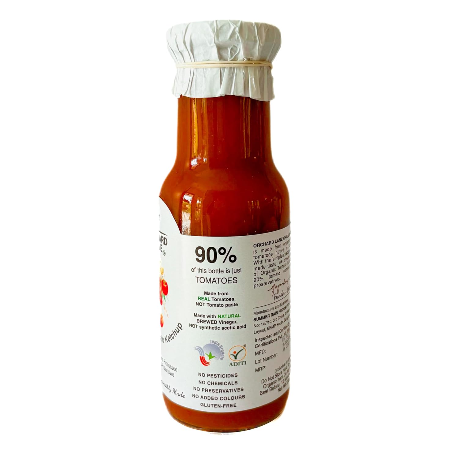 Made from certified organic tomatoes. Periodic audits done via karnataka state pesticide reside laboratory test. Utmost care is given to quality of ingredients. No preservatives or colours or flavours used in manufacturing. No chemicals used to stablise the tomato ketchup. Sometimes there may be a slight tomato juice separation at the top of the surface so please just shake the bottle and use. Thats a small price to pay for avoiding chemicals.